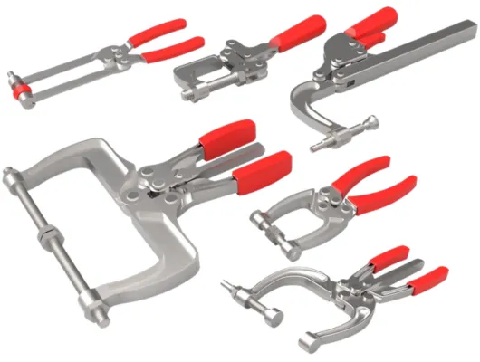 Los clamps tipo pinza Destaco, también conocidos como squeeze action plier clamps, son dispositivos de sujeción mecánica diseñados para fijar piezas de manera rápida y segura mediante un accionamiento tipo pinza. Son ampliamente utilizados en procesos industriales donde se requiere sujeción manual ágil, controlada y repetible, como en ensamblaje, soldadura ligera y operaciones de inspección.